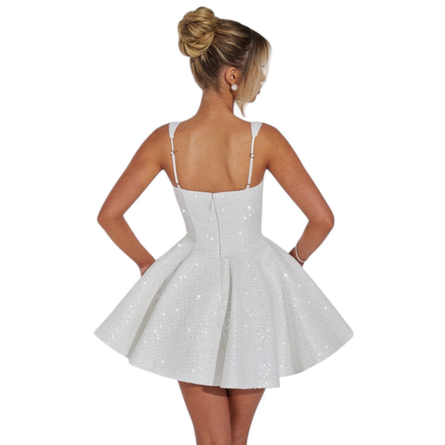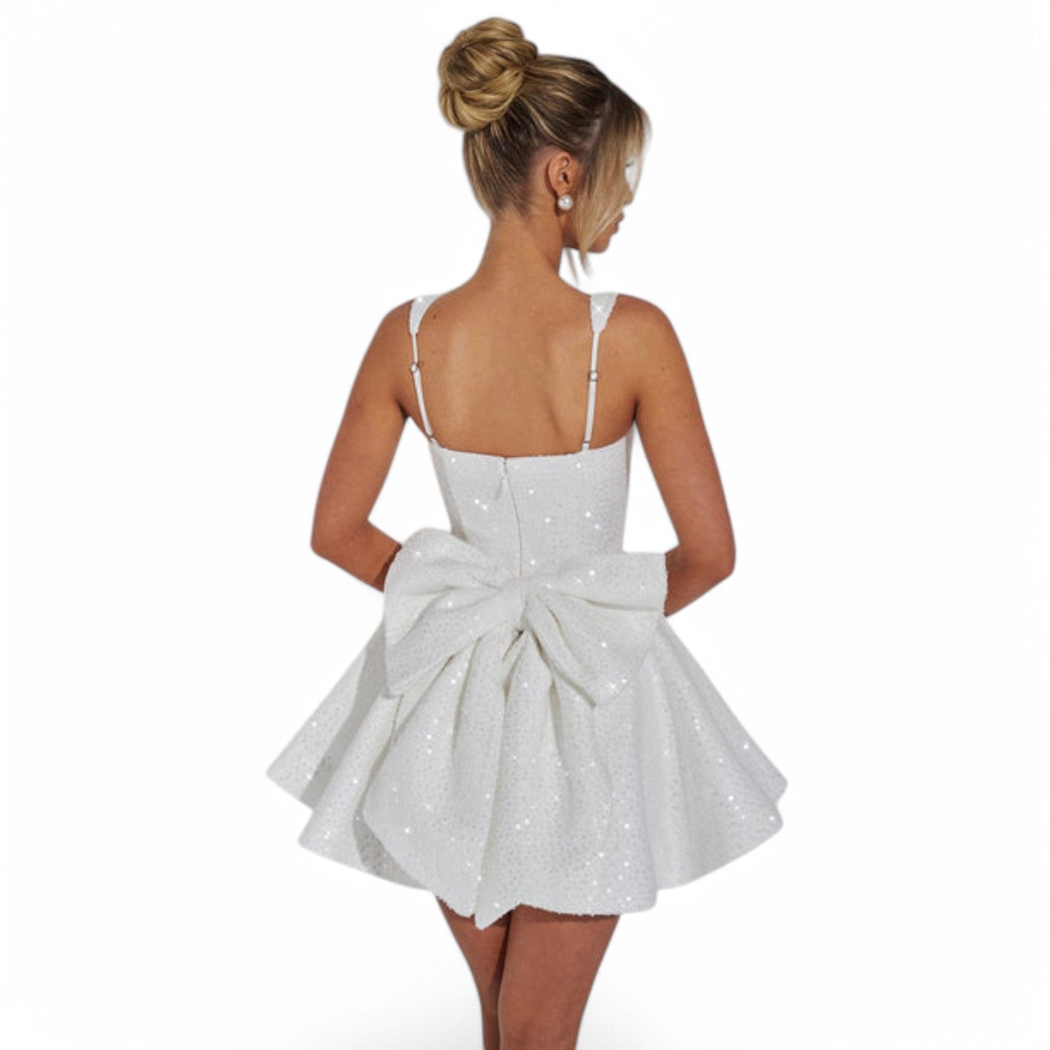 The Nina Mini Dress is a stunning blend of playful elegance and timeless sophistication, crafted in luxurious sequin tweed for a chic, statement look. Featuring a flattering square neckline, a voluminous full-circle skirt, and delicate princess seams, this dress is designed to highlight your silhouette beautifully. The adjustable shoulder straps ensure a perfect fit, while the detachable bow at the back adds a touch of feminine charm. Whether you're stepping into a cocktail party, brunch date, or a stylish evening out, the Nina Mini Dress is the ultimate must-have for modern elegance.